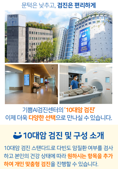 안녕하세요, 기쁨병원입니다.   기쁨병원은 고객님들께 더욱 실질적인 건강 혜택을 드리고자, 기존 검진 시스템을 보완하여 '10대 암 프로그램'을 새롭게 개편하였습니다.   나에게 꼭 필요한 검사로 더 정확하고 꼼꼼하게 건강을 관리해 보세요.