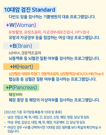 ■ 리뉴얼 프로그램 안내 1. 10대암 스탠다드 검진 주요 다빈도 암 검사 프로그램   2. 개인 맞춤형 정밀 플러스 항목 건강 상태와 가족력에 따른 부위별 정밀 검사 +W(여성질환) / +B(뇌혈관정밀) / +H(심장정밀) / +P(췌장정밀)