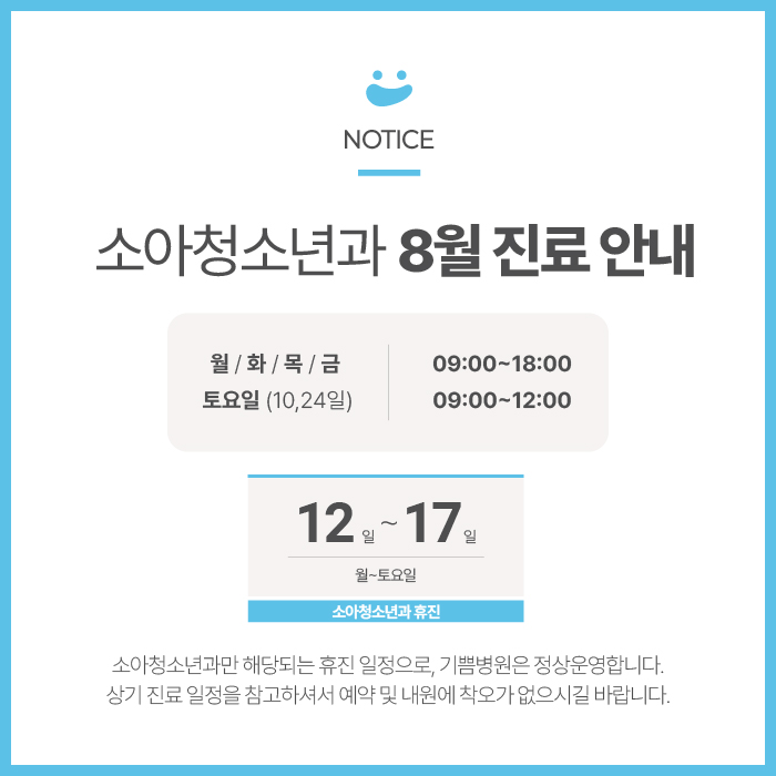 안녕하세요. 보건복지부 인증의료기관, 보건복지부지정 국내 유일의 외과전문 종합병원 기쁨병원입니다.   기쁨병원에서 8월 소아청소년과 진료 안내 공지 드립니다. 8월 12일부터 8월 17일까지 소아청소년과 휴진입니다.   ▶ 휴진일정: 8월 12일(월요일)~17일(토요일)   소아청소년과만 해당되는 휴진으로, 기쁨병원은 정상 운영합니다. 감사합니다.   |