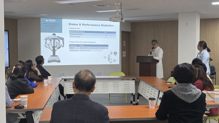 안녕하세요. 외과전문 종합병원 기쁨병원입니다.  기쁨병원의 강리페어 탈장 수술법에 대한 국제적 관심이 이어지고 있습니다. 지난 11월 5일, 몽골에서 온 의료진이 강윤식 병원장을 직접 만나  강리페어 수술법을 배우고 한국의 의료 시스템을 경험하기 위해 병원을 방문했습니다.    실전 중심의 의료 기술 전수 이날 강윤식 병원장은 강리페어 수술법의 개발 배경부터 수술 원리, 환자별 맞춤 적용법, 수술 후 관리 노하우까지 임상 경험을 바탕으로 한 심도 깊은 강의를 진행했습니다. 몽골 의료진은 특히 "재발률이 낮으면서도 회복이 빠른 비결이 무엇인가"에 대해  집중적으로 질문하며 적극적인 학습 의지를 보였습니다.
