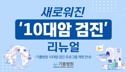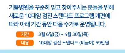 ■ 검진 프로그램 개편 기념 수가 안내리뉴얼을 맞이하여 한시적으로 특별 수가를 적용합니다   ▶ 기간: 2026년 3월 9일(월) ~ 4월 30일(목) ▶ 혜택 내용: 10대 암 스탠다드 검진 → 59만원 (비급여)   ■ 10대암 검진 상세 보기 및 간편 예약 https://www.gibbeumhospital.com/10cancer.asp (※ 상세 항목 및 주의사항을 반드시 확인하시기 바랍니다.) |