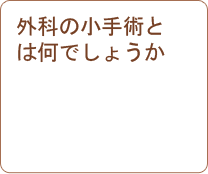 当院で行なっている外科小手術とは脂肪種手術、表皮嚢腫手術、リンパ腺手術、ガングリオン手術、乳房の良性腫瘍の切除術、女性化乳房手術、皮膚および皮下組織の膿瘍、傷の縫合手術、陥入爪がどがあります。